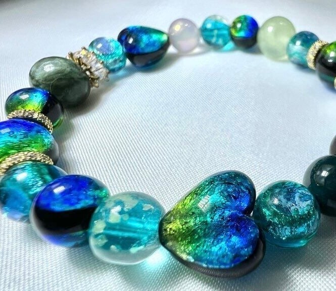 慶良間マリンブルー 蓄光琉球ホタルガラスブレスレット — 青から緑へ溶け合う、海のグラデーション —