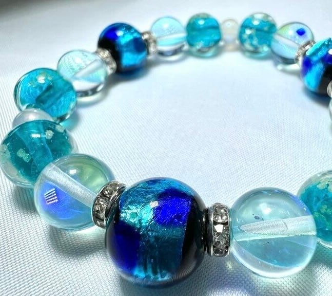癒しの琉球ブルー! ― 静かな海が、心をほどく ― 蓄光琉球ホタルガラスと海いろフラッシュガラスのブレスレット