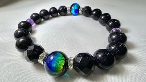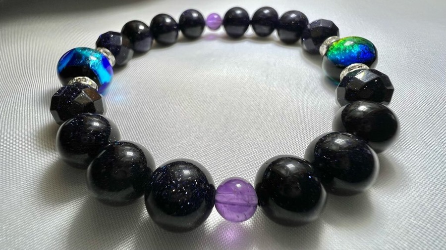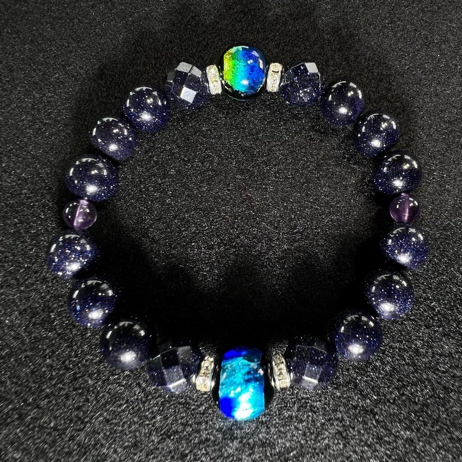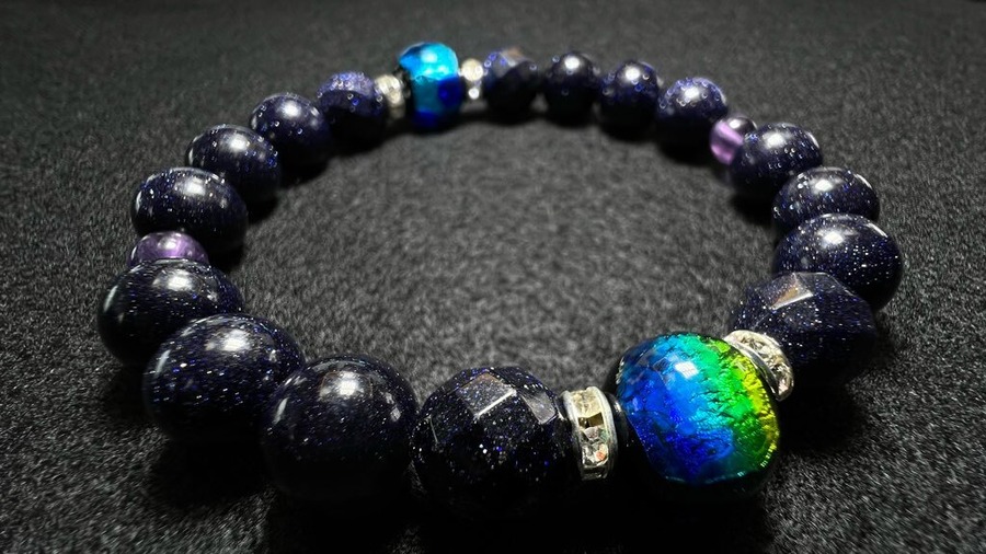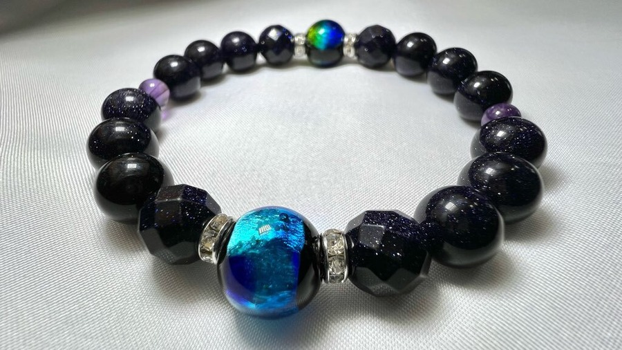 ブルーサンドストーン(ブルーゴールドストーン)は、「人生において最良の出会いを引き寄せる」「眠っている才能を引き出す」などの意味を持つ、人工的に作られたガラスのパワーストーンです。