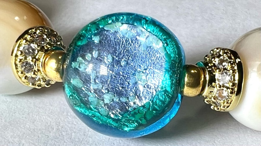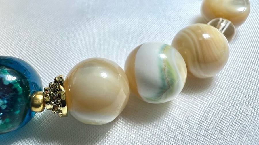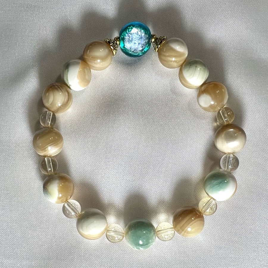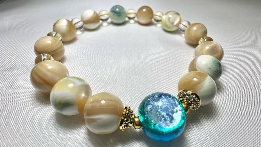 夜光貝10mmブレスレット 商売繁盛パワーストーンと琉球ホタルガラス付