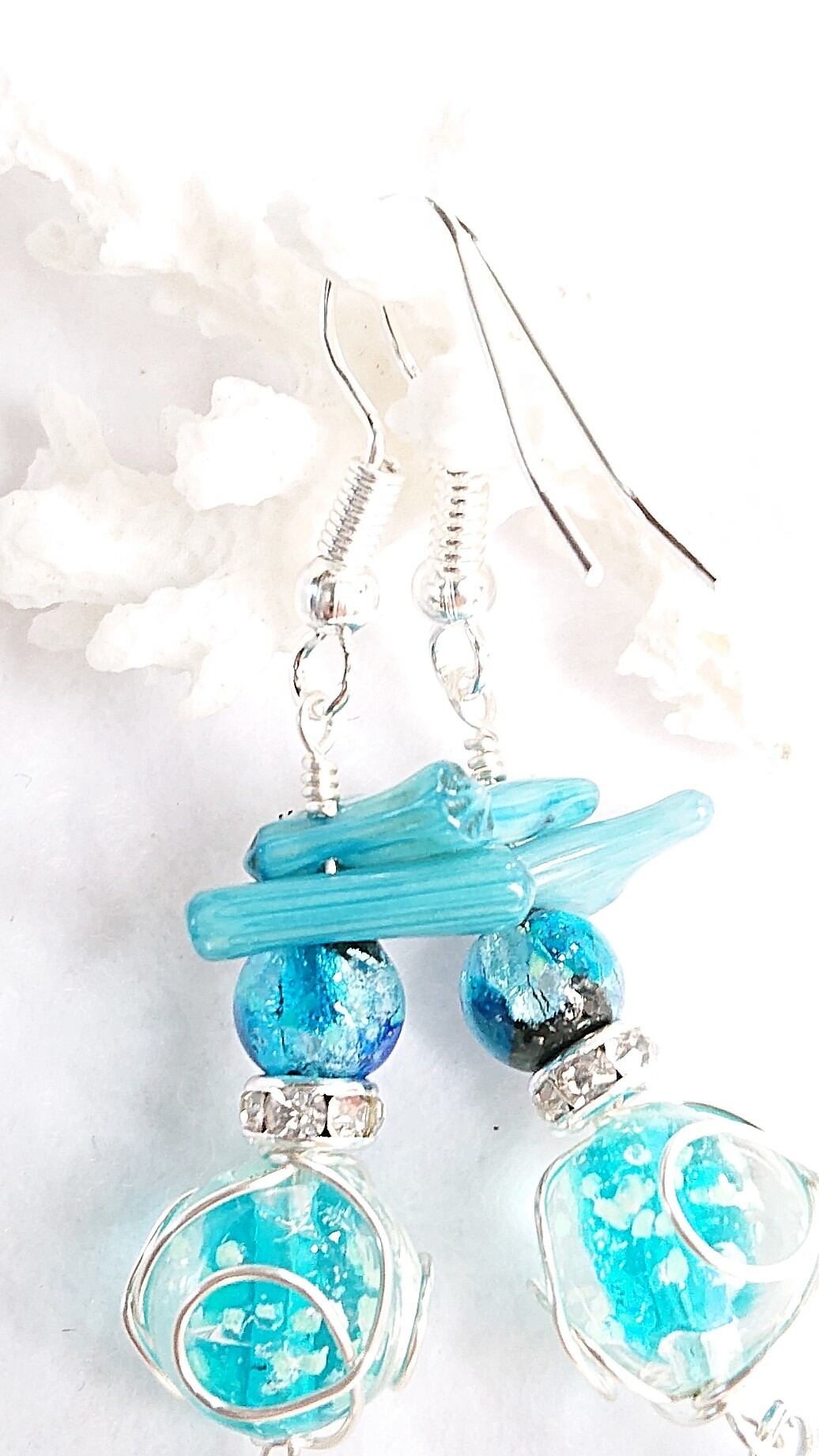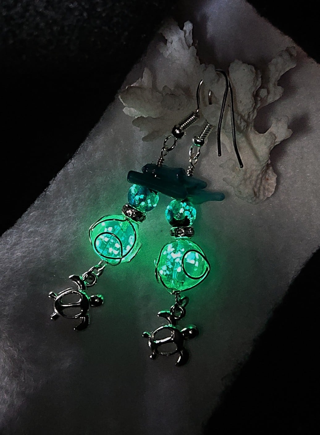 青色珊瑚とウミガメの蓄光(夜光)ピアス
