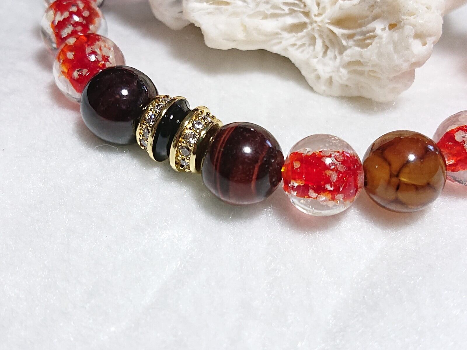 透明感ある夜光赤色ガラスとパワーストーンのブレスレット