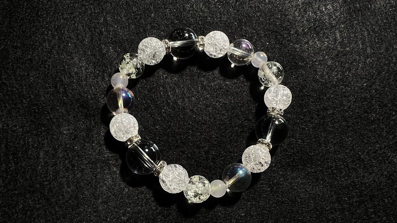 スタンダード水晶とクラック加工水晶、チタン蒸着コーティングしたアクアクリスタルを基調に(心身浄化・魔除けの潜在能力開花などのパワーストーン)