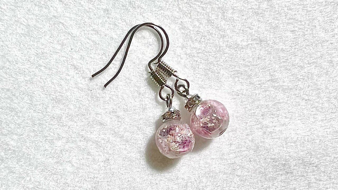 やわらかなピンクが可愛い琉球ホタルガラスの蓄光(夜光)タイプの8mm珠ピアスです