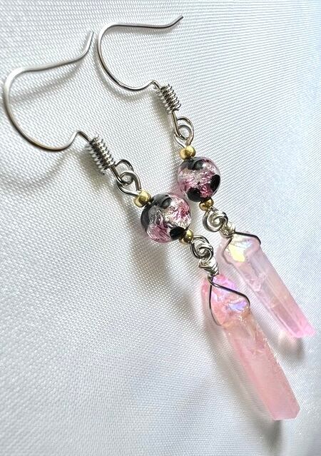 氷柱水晶とホタルガラス【蓄光】のピアス ー耳元に咲く、クリスタルピンクー