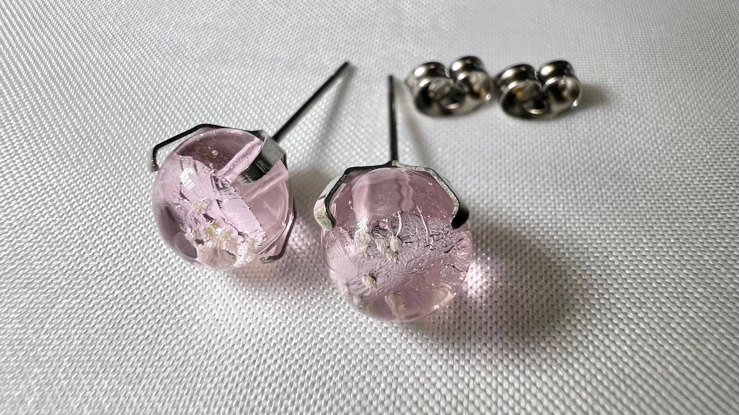 透明感あるピンクのガラスに銀箔の入った琉球ホタルガラス8mm珠をスタッドピアスにしました